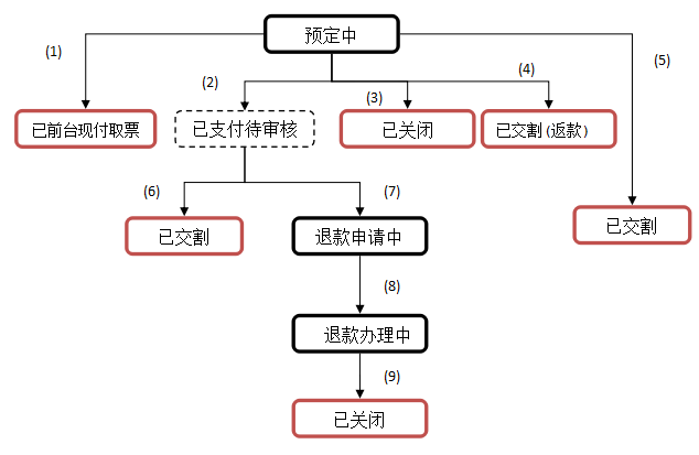 十二、关于异步通知 十三、谁还可以操作你的订单和代理商账户? 十四、整体流程说明 十五、关于官方游客通知总个接口为订单设计了7种状态,分别是预定中,退款申请中,已关闭,已交割,已前台现付取票。状态转换如图2-1所示。